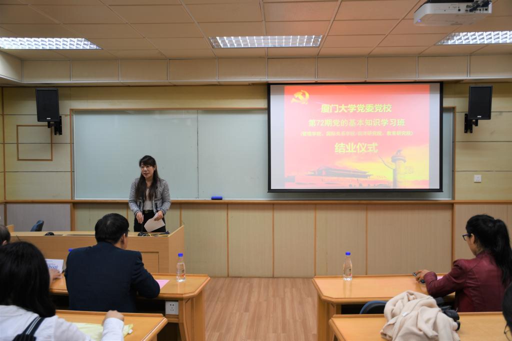 2019年4月19日,厦门大学党委党校第72期党的基本知识学习班(管理学院、国际关系学院/南洋研究院、教育研究院)结业仪式在嘉庚一409室顺利召开。参加此次活动的嘉宾有国际关系学院/南洋研究院党委书记张必华、教育研究院党委副书记傅伯奇、管理学院党委副书记戴蓥、管理学院党务秘书蒋超杰、教育研究院团委书记魏艳,国际关系学院/南洋研究院辅导员郭晓玲、管理学院辅导员刘晓宇等。党的基本知识学习班全体学员到场参加结业仪式。结业仪式由管理学院党委副书记洪秋霞主持。