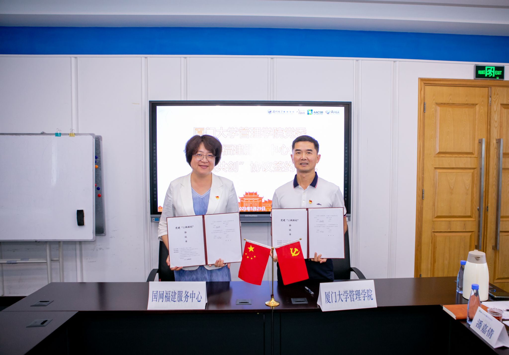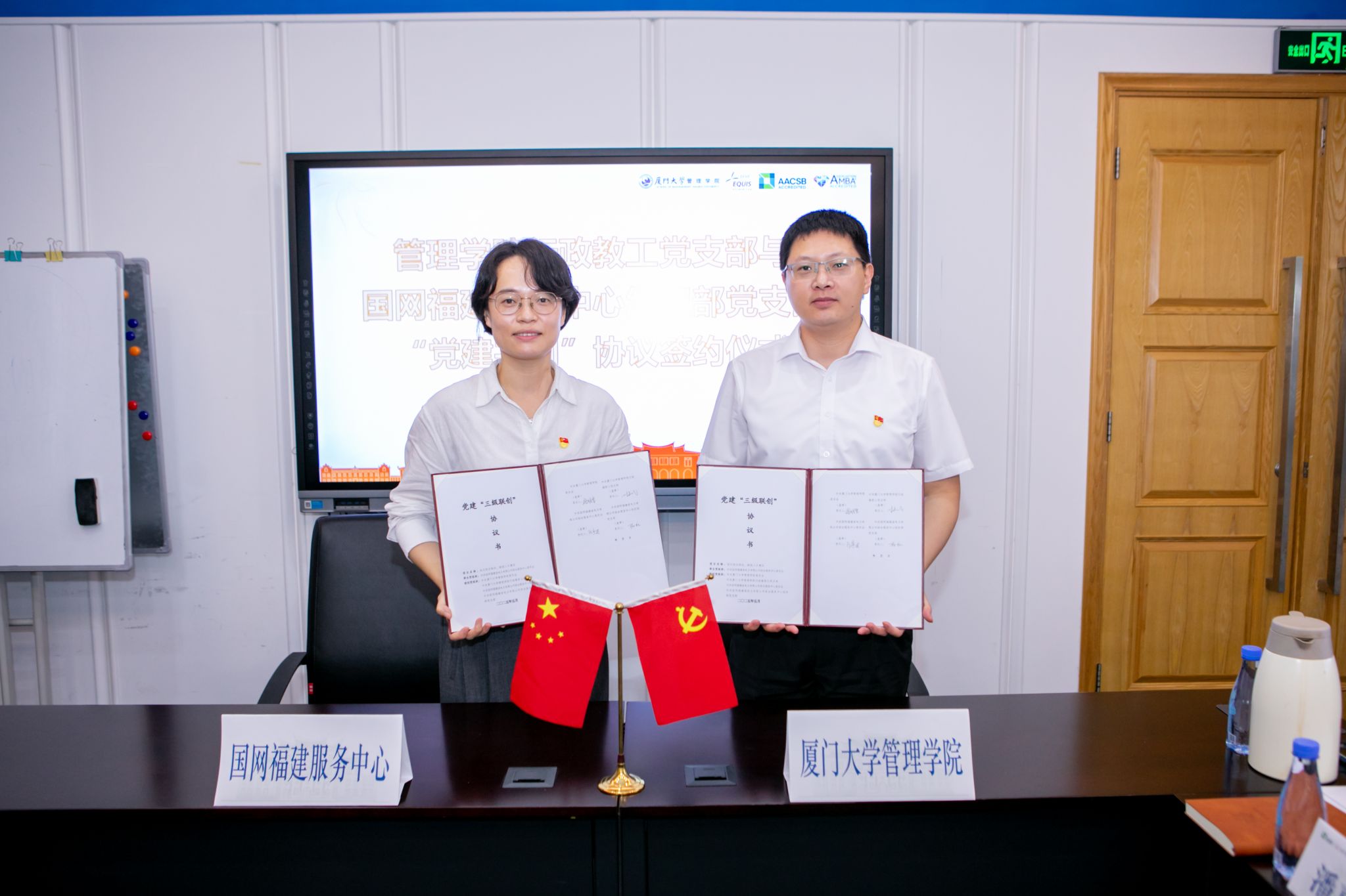 随后,双方举行了党建“三级联创”协议签约仪式。张明智与张宇芸签订管理学院党委和国网福建服务中心党委共建协议。管理学院行政教职工党支部书记林嘉斌与国网福建服务中心组织部党支部书记杨艳签订支部共建协议。这标志着双方党建工作迈入“携手共建、资源共享、发展共赢”新阶段。