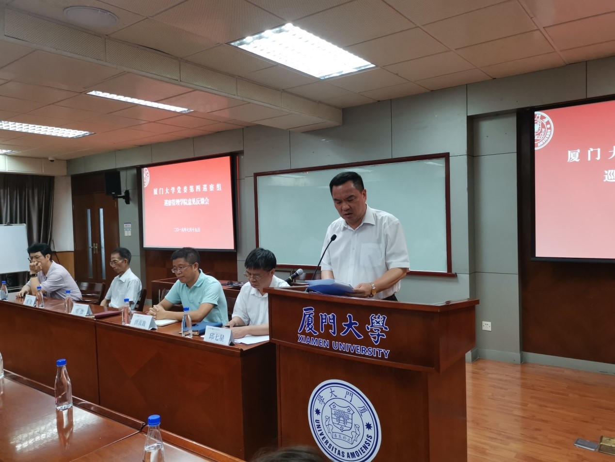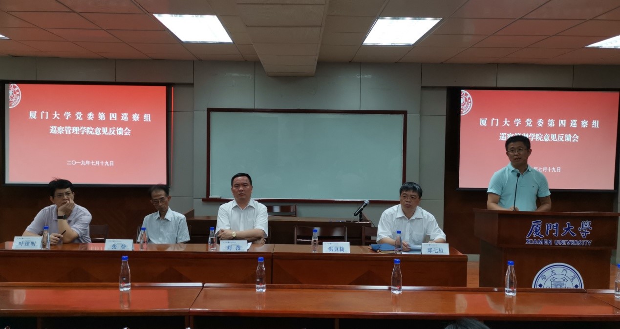 7月19日下午,厦门大学党委第四巡察组巡察管理学院意见反馈会在嘉庚二201报告厅召开。第四巡察组组长、信息学院党委书记刘弢,副组长、财务处原副处长张莹,校党委巡察办副主任洪真裁,厦门大学基层党建工作联络员杨敬达出席会议。会议由院党委书记邱七星主持。管理学院在职教职工、离退休教师代表等100余人参加了会议。