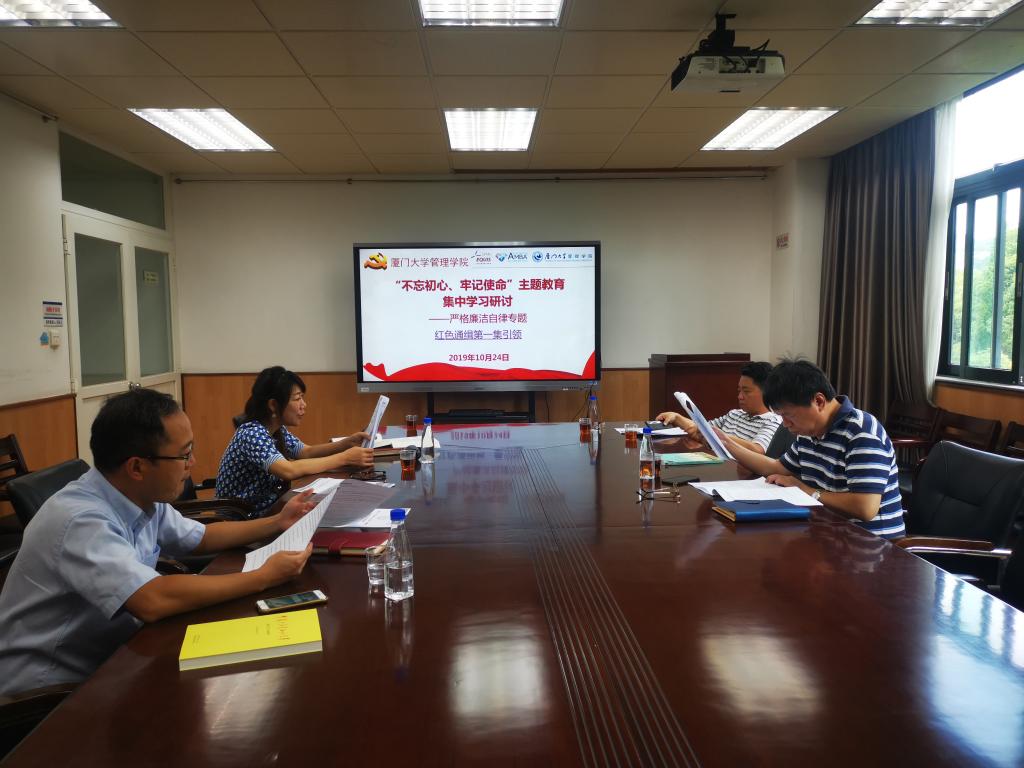 10月24日上午,管理学院党员领导干部围绕“严格廉洁自律”专题进行“不忘初心、牢记使命”主题教育第八次集中学习研讨。院党委副书记洪秋霞主持学习会。