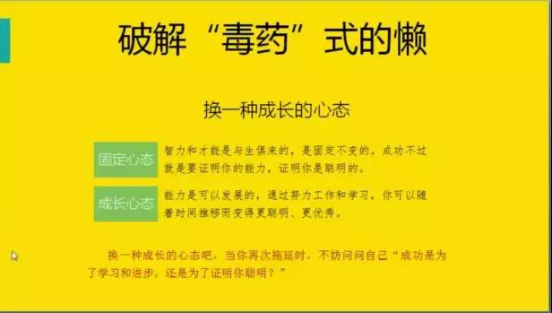 那么,如何破解“毒药”式的懒?祝靖媛给出了“换一种成长的心态”的建议,即从注重结果的“固定心态”转变为注重过程的“成长心态”。成功不是为了证明自己的聪明,相反,同学们可以通过努力学习和工作提高自己的能力,变得更优秀,从而取得成功。此外,努力也是一种能力,这种能力突出表现为自控力。有关研究表明,非智力因素与成就的关联远超智力因素。为了加深同学们的理解,祝靖媛通过“棉花糖实验”的例子,阐明了延迟满足能力、自控力对成功的作用。这些知识让同学们了解到,自控力是取得长期成功的保证。