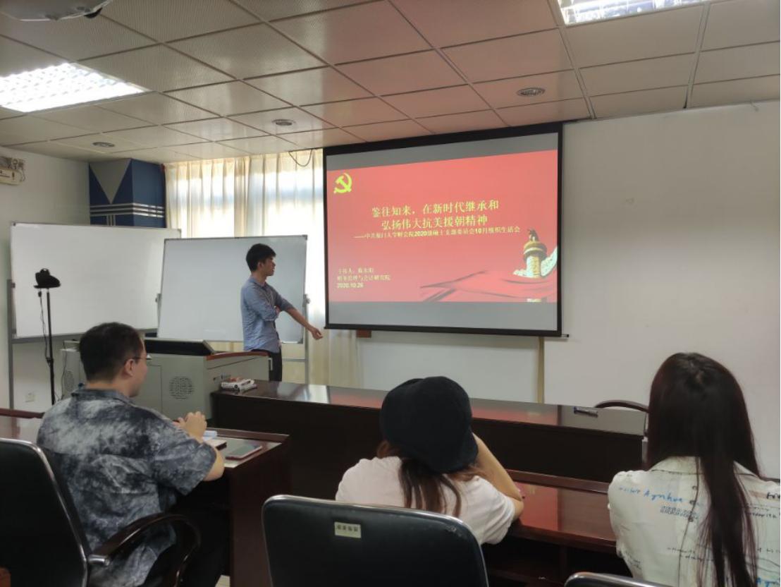 厦门大学财务管理与会计研究院2020级硕士党支部“学四史”主题党课在嘉庚二501召开,本次活动以“鉴往知来,在新时代继承和弘扬伟大抗美援朝精神”为主题。