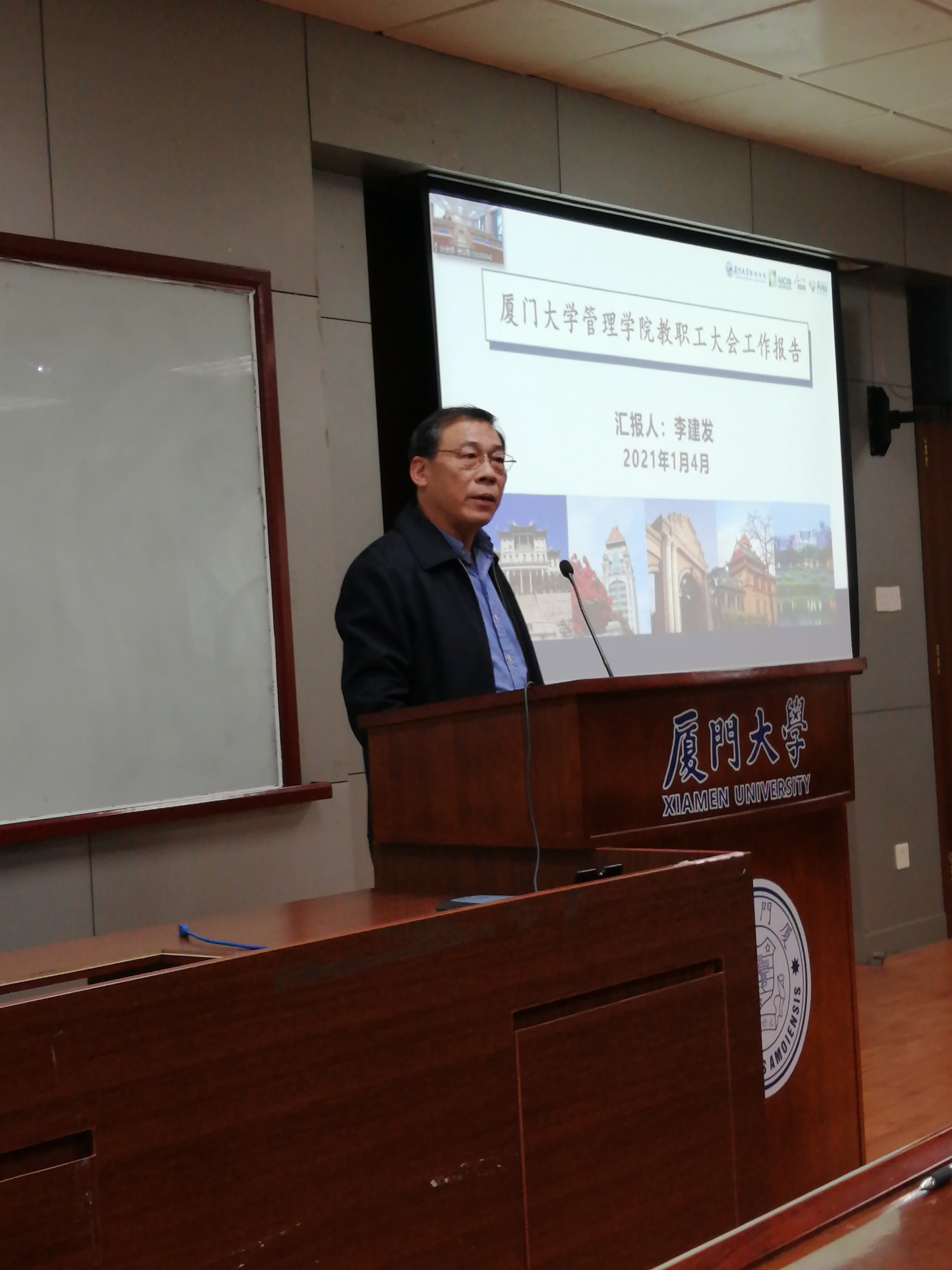 2021年1月4日下午,厦门大学管理学院、财务管理与会计研究院教职工大会在嘉庚二201报告厅召开。厦门大学党委常务副书记、管理学院院长李建发,管理学院常务副院长吴超鹏,党政领导班子成员及全院教职工200余人参加了本次会议。会议由管理学院党委书记邱七星主持。