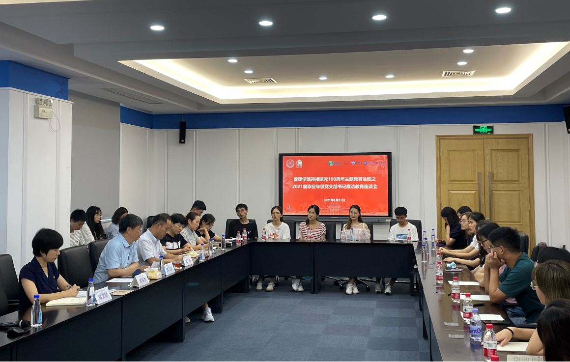 随后,管理学院以本次专题党课为契机,召开了迎接建党100周年主题教育活动之2021届毕业年级党支部书记廉洁教育座谈会。院党委邱七星书记首先结合自身学习、工作经历,从身边的人和身边的案例说起,围绕政治标准、法律法规、个人发展以及初心使命等内容,要求同学们在未来的工作中要知敬畏、存戒惧、守底线,培养廉洁从业的高度自觉性,恪守职业操守,坚持知行合一。院党委郑碧娇副书记寄语同学们要不忘初心、牢记使命,传承厦门大学的优良校风,吸收和发扬学校的优良传统,为国家富强和民族振兴做出自己的贡献。与会学生党员纷纷表示,作为即将走向社会的大学生,要有时代责任感和使命感,要把个人发展同学校、社会、国家发展结合起来,克己奉公,廉洁自律,努力在时代浪潮中大展宏图。