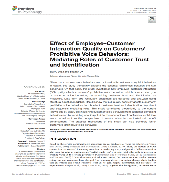 我院企业管理系2018级博士研究生陈国福与旅游系2018级博士研究生李书昊合作撰写的论文《Effect of Employee-customer Interaction Quality on Customers’ Prohibitive Voice Behaviors: Mediating Roles of Customer Trust and Identification》在SSCI期刊《Frontiers in Psychology》正式发表。