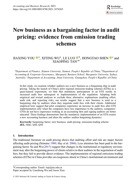 我院财务学系2018级博士研究生伍翕婷与导师游家兴教授、澳大利亚麦考瑞大学罗乐教授、暨南大学管理学院沈洪涛教授、谭小平教授合作撰写的论文《New Business as a Bargaining Factor in Audit Pricing: Evidence from Emission Trading Schemes》在我院国际B类期刊《Accounting and Business Research》2021年第6-7期正式发表。