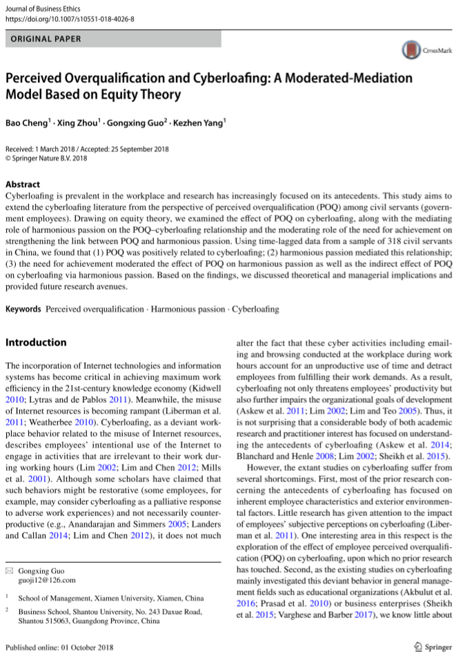 2018年10月,厦门大学管理学院企业管理系2016级博士研究生程豹与导师周星教授合作撰写的论文《Perceived Overqualification and Cyberloafing: A Moderated-Mediation Model Based on Equity Theory》在国际A类期刊《Journal of Business Ethics》上正式在线发表,该期刊属于FT 45之一。
