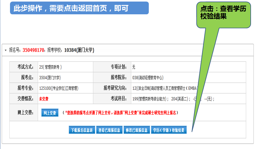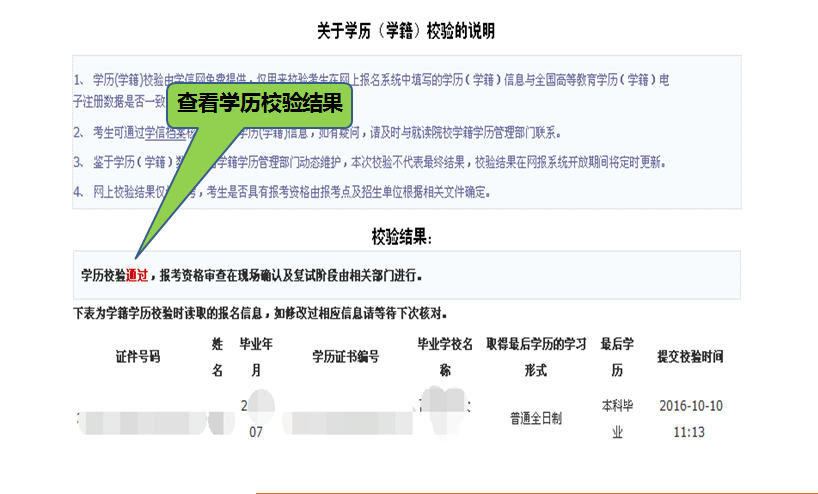 步骤 15:三天内可查看学籍学历检验结果。(学历(学籍)校验涉及到的信息有:身份证号、姓名、毕业年月、学历证书编号、毕业学校名称、取得最后学历的学习形式、最后学历,请考生务必确保填写的信息与实际证件完全一致,如果填写有误,请及时修改。)