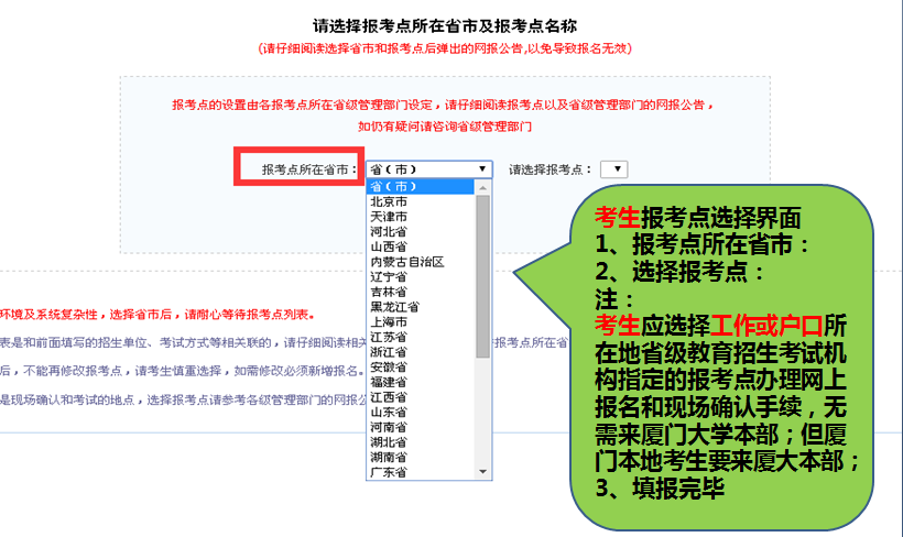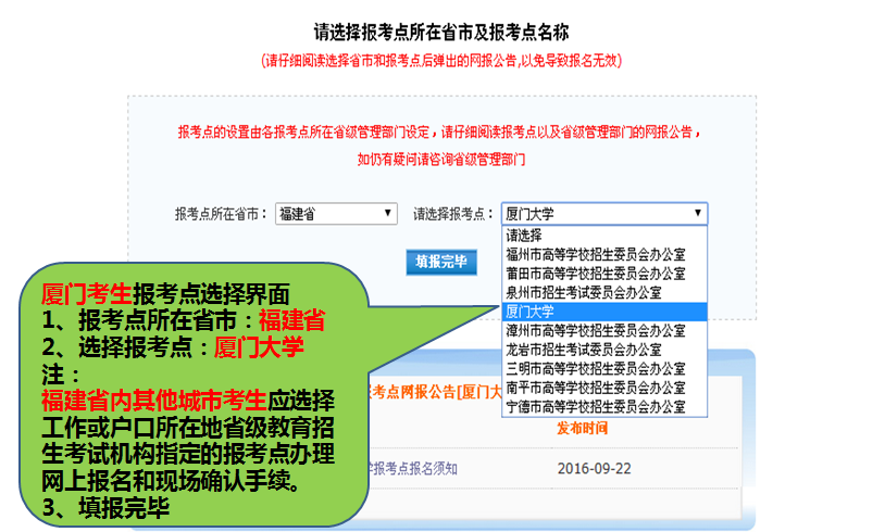 福建省内考生,可参看福建省教育考试院的通知,根据户口或工作地点选择相应的报考点,详见:http://www.eeafj.cn/ykgsgg/20160923/6092.html