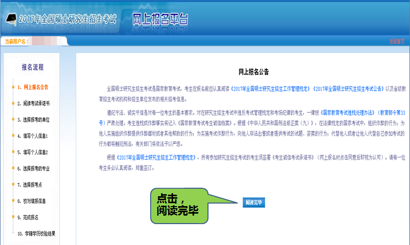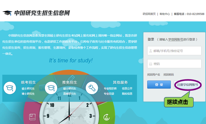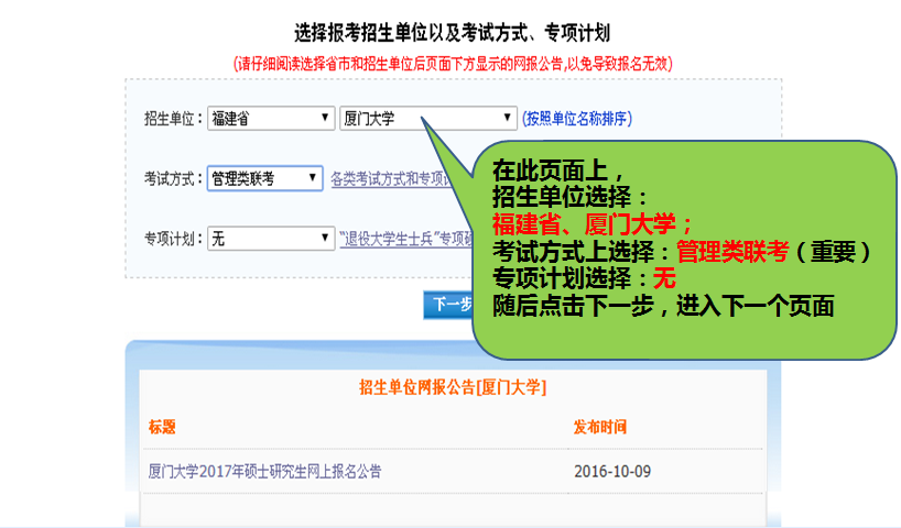 考生登录“中国研究生招生信息网”(公网网址:http://yz.chsi.com.cn/,教育网址:http://yz.chsi.cn/)浏览报考须知,按教育部、省级教育招生考试管理机构、报考点以及报考招生单位的网上公告要求报名。