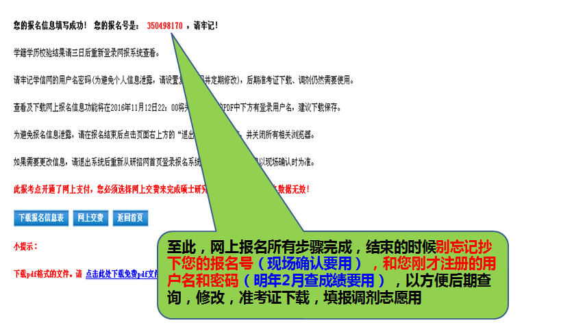 步骤 14:生成7位报名号,请务必谨记,现场确认需提供,下载报名信息表