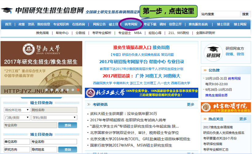 步骤1:登录“中国研究生招生信息网”(公网网址:http://yz.chsi.com.cn/,教育网址:http://yz.chsi.cn)