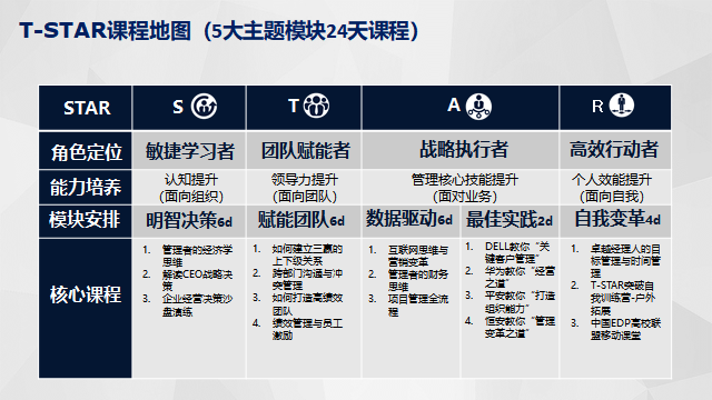 T-STAR卓越经理人成长计划采取模块制,共计五大模块。每月集中2-2.5天学习,学时24天(含开班讲座、移动课堂),课程总时间跨度一年。
