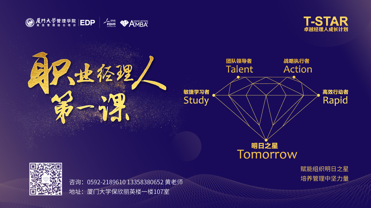 厦门大学管理学院EDP中心全新升级的高级经理人培养计划即“T-STAR卓越经理人成长计划”,着眼于个体认知、管理效能、团队领导力、战略执行力的全方位提升,践行“学习、实践、反思”的教育理念,旨在助力各类组织培养高潜力管理者,加快完成人才第二梯队建设,更积极地拥抱变化,更稳健地迎接挑战。