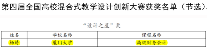 近日,第四届全国高校混合式教学设计创新大赛落下帷幕。本次大赛于今年6月份正式启动,经全国各高校的初赛选拔、参赛教师的复赛材料审核,共有来自全国的763组选手进入复赛。经过激烈的复赛角逐,我院杨绮老师团队(主讲老师:杨绮副教授,团队成员:曲晓辉教授、肖华教授)的《高级财务会计》课程脱颖而出,荣获该项大赛的“设计之星”奖。