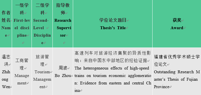 日前,福建省教育厅、福建省学位委员会正式公布了2020年福建省研究生优秀学位论文评选结果。经培养单位申报推荐、省学位办委托第三方机构组织学科专家评审等,共评出2020年福建省优秀学术硕士学位论文143篇。我院旅游与酒店管理系旅游管理专业温志洪同学的硕士学位论文《高速列车对旅游经济集聚的异质性影响:来自中国东中部地区的经验证据》(导师:周波教授)入选2020年福建省优秀学术硕士学位论文。厦门大学37个一级学科、共计42篇学术硕士学位论文入选2020年福建省优秀学术硕士学位论文。