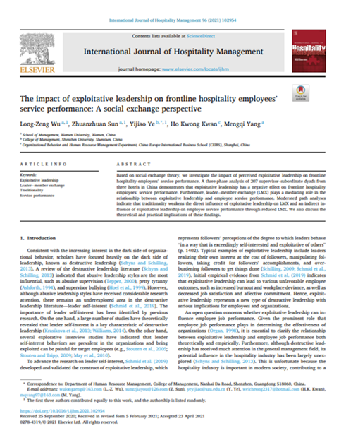 我院企业管理系吴隆增教授、2019级企业管理专业博士研究生孙专专、深圳大学管理学院叶一娇助理教授、中欧国际工商学院组织行为与人力资源管理系关浩光副教授以及2021级技术经济及管理专业博士研究生杨梦琦合作撰写的论文《The impact of exploitative leadership on frontline hospitality employees’ service performance: A social exchange perspective》在我院国际A类期刊《International Journal of Hospitality Management》2021年第96卷正式发表。