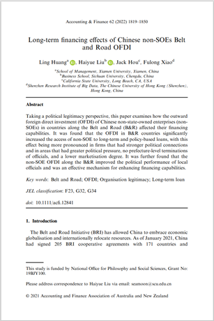 我院财务学系2020级硕士研究生黄玲与四川大学刘海月教授、美国加州州立大学长滩分校Jack Hou教授以及香港中文大学(深圳)硕士生Fulong Xiao合作撰写的论文“Long-term financing effects of Chinese non-SOEs Belt and Road OFDI”在期刊Accounting & Finance正式发表。