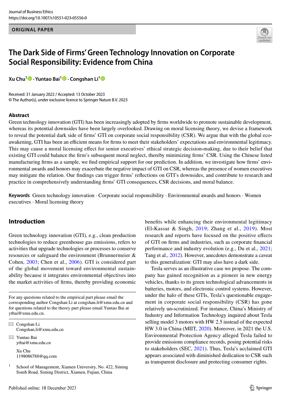 2023年12月18日,我院企业管理系2020级博士研究生褚旭(第一作者)与导师白云涛教授及李丛杉助理教授的合作论文“The dark side of firms’ green technology innovation on corporate social responsibility: Evidence from China”在我院A类期刊Journal of Business Ethics上在线刊出。