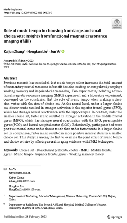 我院市场学系2019级博士研究生张凯俊与导师叶军教授(通讯作者)、汕头大学医学院硕士生刘鸿坤合作撰写的论文《Role of music tempo in choosing from large and small choice sets: insights from functional magnetic resonance imaging (fMRI)》在我院国际B类期刊《Marketing Letters》正式在线发表。