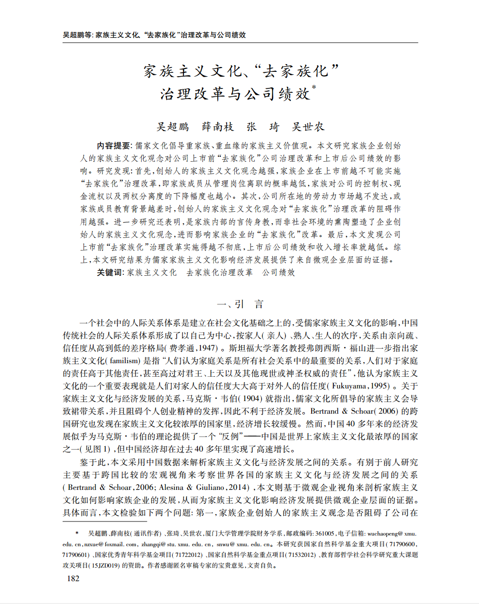 儒家文化倡导重家族、重血缘的家族主义价值观。基于这一思想,该论文以 2004—2016 年间 495 家中国家族上市公司为样本,研究了家族企业创始人的家族主义文化观念对公司上市前“去家族化”公司治理改革和上市后公司绩效的影响。研究发现:首先,创始人的家族主义文化观念越强,家族企业在上市前越不可能实施“去家族化”治理改革,即家族成员从管理岗位离职的概率越低,家族对公司的控制权、现金流权以及两权分离度的下降幅度也越小。其次,公司所在地的劳动力市场越不发达,或家族成员教育背景越差时,创始人的家族主义文化观念对“去家族化”治理改革的阻碍作用越强。进一步研究还表明,是家族内部的言传身教,而非社会环境的熏陶塑造了企业创始人的家族主义文化观念,进而影响家族企业的“去家族化”改革。最后,他们发现公司上市前“去家族化”治理改革实施得越不彻底,上市后公司绩效和收入增长率都越低。该论文的研究结果为儒家家族主义文化影响经济发展提供了来自微观企业层面的证据。
