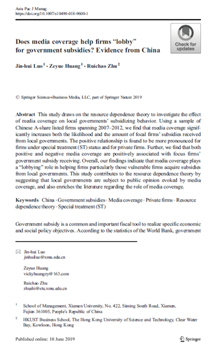 我院会计学系2018级博士研究生黄泽悦与会计学系教授、博士生导师罗进辉以及2018届会计学硕士朱睿超合作撰写的论文“Does media coverage help firms ‘lobby’ for government subsidies? Evidence from China” 于2019年6月在《Asia Pacific Journal of Management》网络刊出。