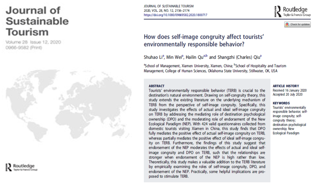 我院旅游与酒店管理系旅游管理专业2018级博士研究生李书昊与导师魏敏教授以及屈海林教授、丘尚知助理教授合作撰写的论文《How does self-image congruity affect tourists’ environmentally responsible behavior?》在我院国际B类期刊《Journal of Sustainable Tourism2020年第12期正式发表。