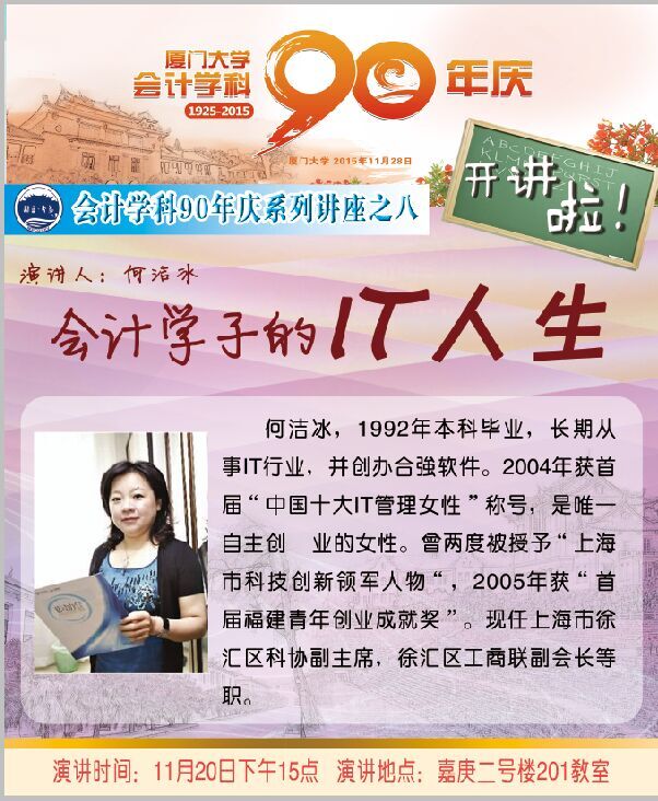 何洁冰,1992年本科毕业,创立合强办公软件公司。2004年获首届“中国十大IT管理女性”称号,是唯一自主创 业的女性。曾两度被授予“上海市科技创新领军人物”,2005年获“首届福建青年创业成就奖”。