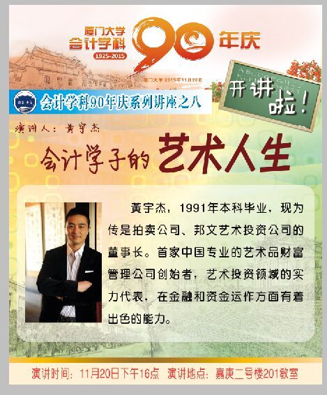 黄宇杰,1991年本科毕业,现为传是拍卖公司、邦文艺术投资公司的董事长。首家中国专业的艺术品财富管理公 司创始者,艺术投资领域的实力代表,在金融和资金运作方面有着出色的能力。