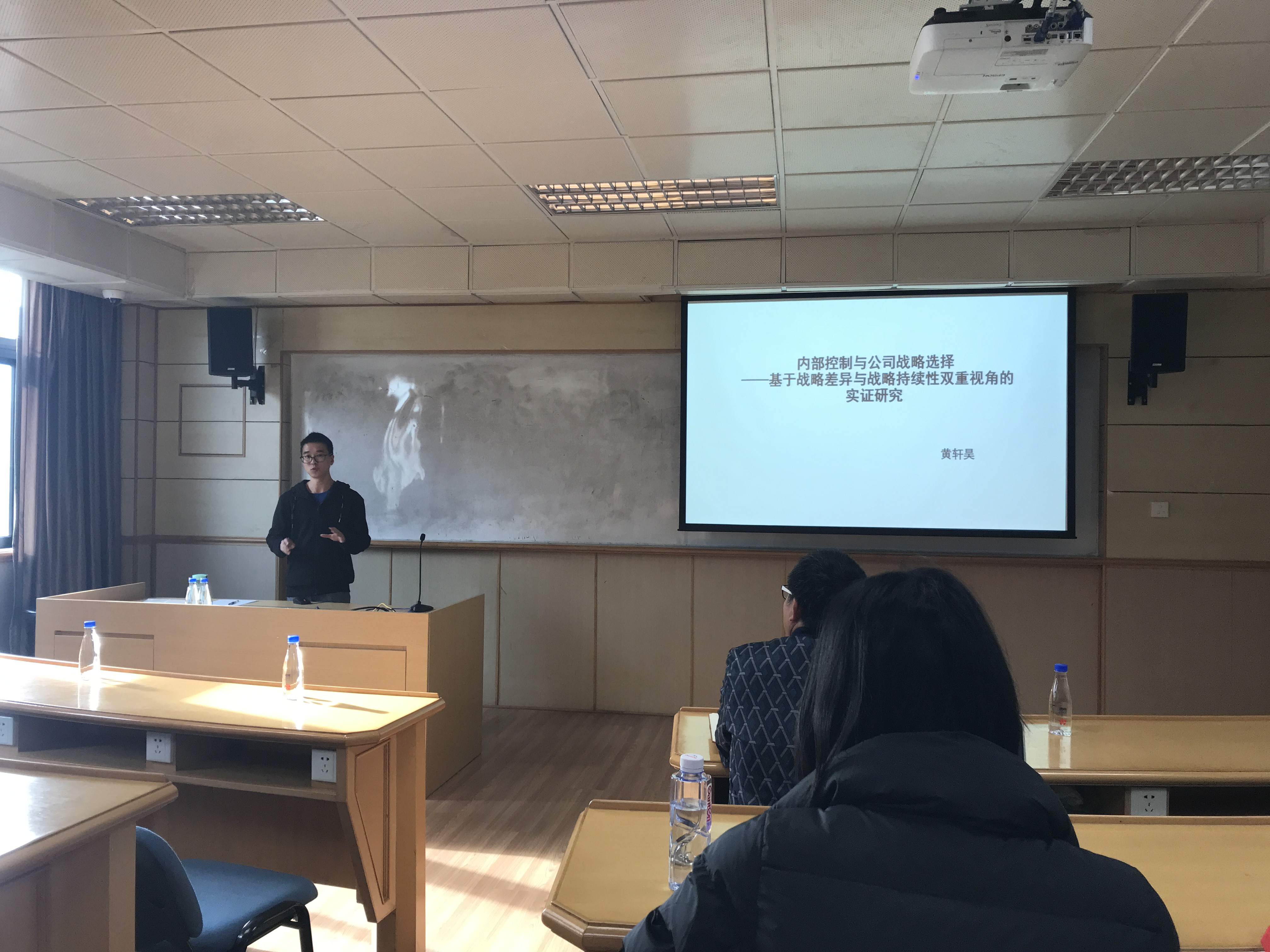 2017年12月26日,“厦门大学会计学科教师与研究生系列Seminar”之二十二于下午3点准时举行。这次Seminar的报告人是会计系15级博士研究生黄轩昊,他与到场的会计系师生分享的论文题目是《内部控制与公司战略选择——基于战略差异与战略持续性双重视角的实证研究》。