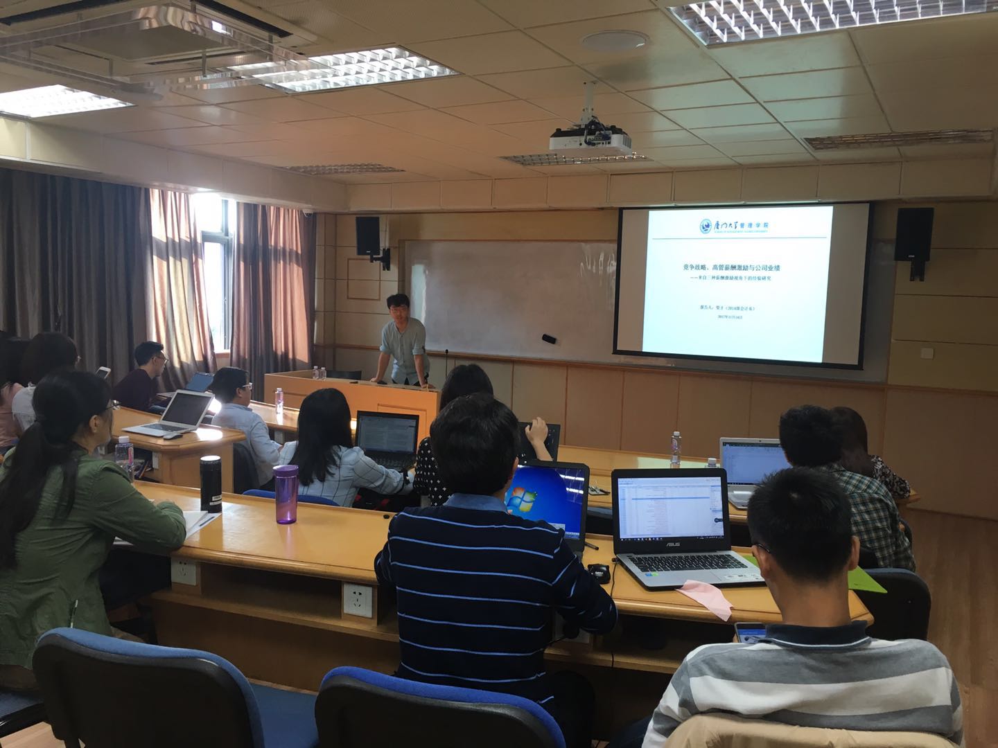2017年11月14日下午3点,由14级博士生柴才主讲的“竞争战略、高管薪酬激励与公司业绩——来自三种薪酬激励视角下的经验研究”讲座在嘉庚一409教室顺利举行,管理学院张国清教授出席并主持讲座。