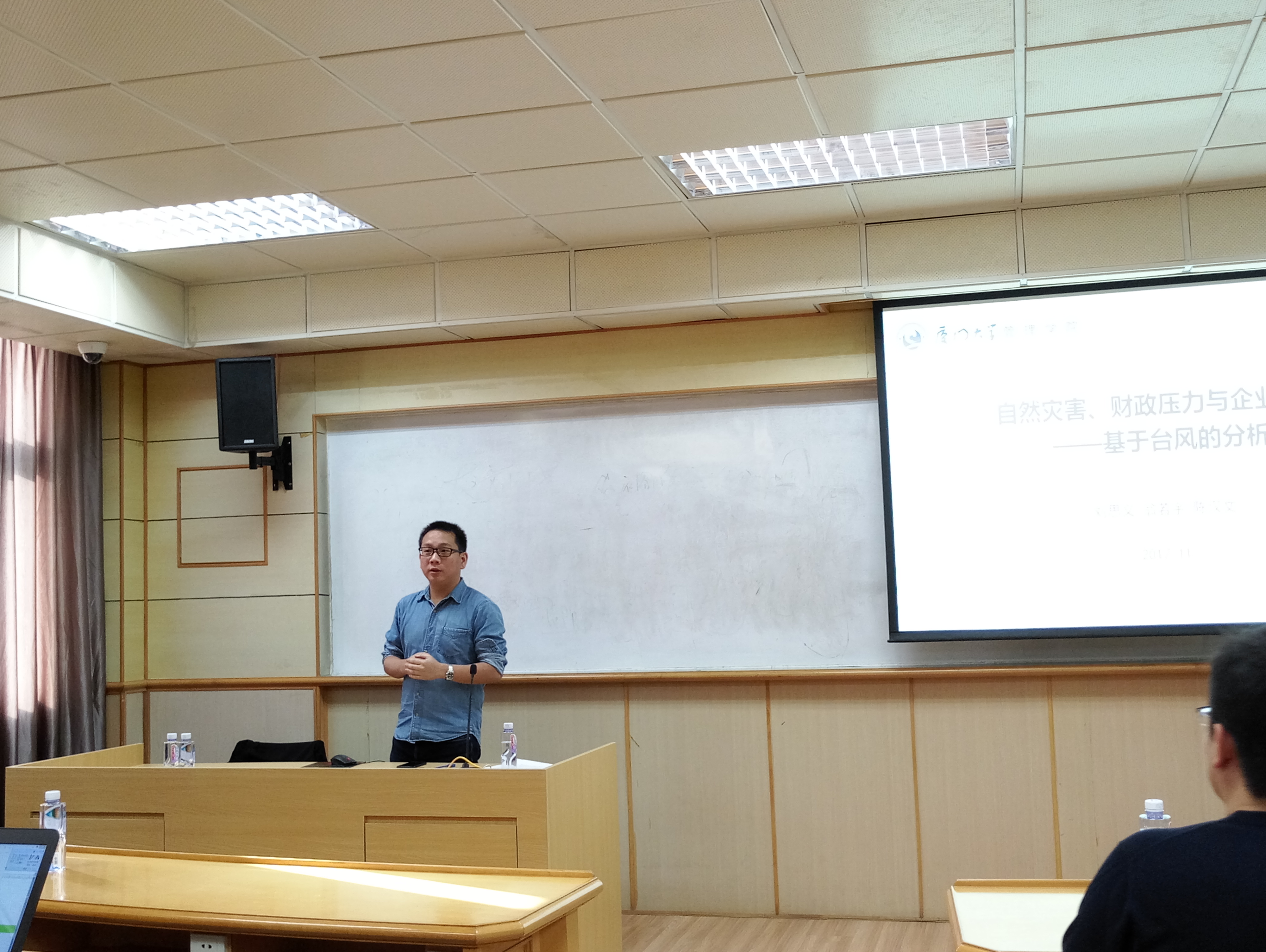 2017年11月21日,刘思义博士在嘉庚一409室报告了自己的论文,论文题目是“自然灾害、财政压力与企业避税——基于台风的分析”。李成老师在现场与刘博士进行了探讨和点评。