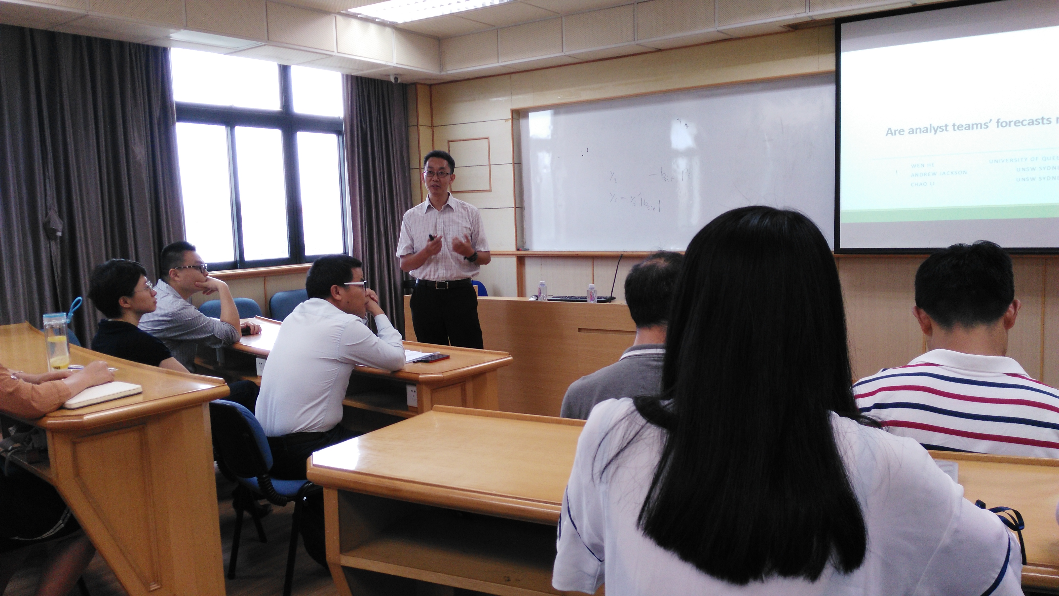 第九期Seminar于05月16日下午15点整如期在厦门大学嘉庚一号楼409室举行,本期邀请的嘉宾是来自昆士兰大学的何文老师。他为在场师生呈现了与Andrew Jackson和Chao Kevin Li合作的工作论文“Are analyst teams’ forecasts more accurate?”。