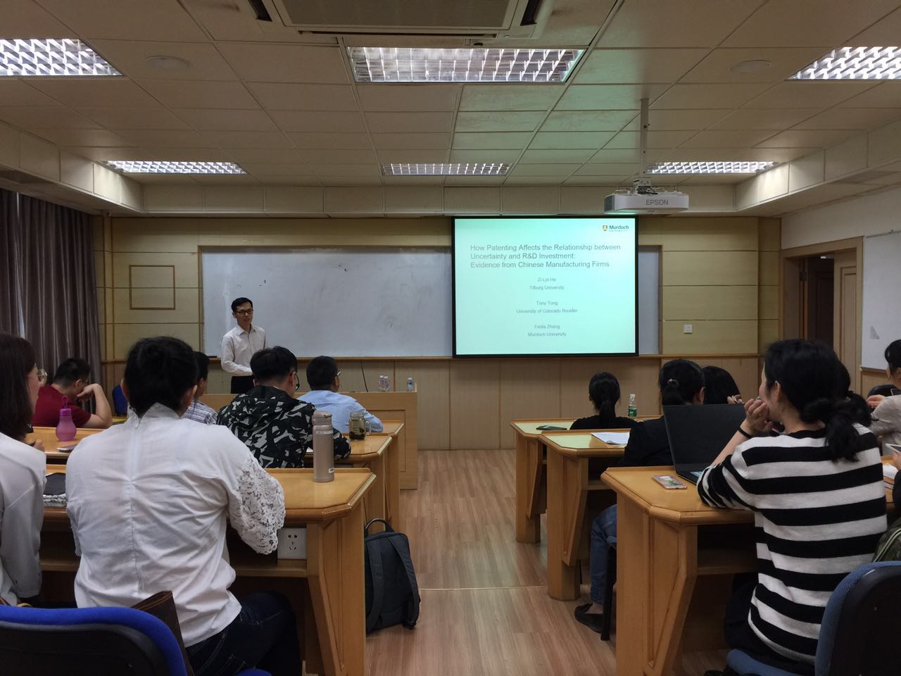 第六期Seminar于04月25日下午15点整如期在厦门大学嘉庚一号楼409室举行,本期邀请来的嘉宾是张飞达博士。他带来了与Zi-Lin He以及Tony Tong合作的工作论文“The Relationship between Uncertainty and R&D Investment: Evidence from China”。
