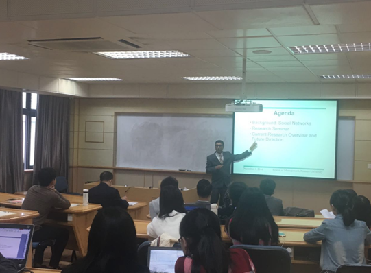 2016年12月1日星期四上午8:30-10:00,来自加拿大不列颠哥伦比亚大学(UBC)Arjun Bhardwaj 博士在保欣丽英楼409教室分享了题目为“A Two-Wave Study of Self-Monitoring Personality, Social Network Churn, and In-Degree Centrality in Close Friendship and General Socializing Networks”的演讲,主要内容是介绍了Arjun Bhardwaj 博士关于社会网络的研究文章,主题是检验自我控制的个性特征在塑造两种重要社会关系网络类型的中的作用以及动态变化的过程。讲座参与者包括唐炎钊教授、刘雪峰教授、白云涛副教授、俞满娇助理教授、李杰助理教授、赖国伟助理教授等多名老师以及众多企业管理系硕士研究生和博士研究生。