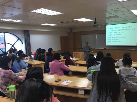 2016年12月16日星期五上午8:30-11:30,企业管理系李卫东教授在成枫楼208教室分享了主题为“理性主义、经验主义和真实——对社会学科主流研究范式的一个考察”的演讲,主要内容是探究现有社会学科研究领域的不足,将具身主义引入社会科学研究的重要意义与方法。讲座参与者包括宋培林教授、杜兴强教授、何燕珍副教授、白云涛副教授、成瑾副教授、俞满娇助理教授、赖国伟助理教授等多名老师以及众多企业管理系硕士研究生和博士研究生。