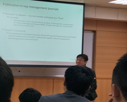 刘雪峰老师首先致开幕词,欢迎陈国立老师的到来,介绍陈老师的研究领域和学术成果,并请陈国立老师作报告。在报告开始前,陈老师介绍了自己的学习、生活、工作经历和研究的心理路程。陈老师目前专注的研究领域主要是公司治理和高管团队的研究,陈老师研究成果丰硕,先后在国际顶级管理期刊发表十余篇文章,他指出当前学术界是一个典型的“红海”,虽然管理学科相比于会计、财务等学科,研究主题比较多,但是在国外顶级管理刊物发表文章的规则十分明确,且刊物接收文章数量一定且有限,而投稿数量成几何倍数增长,供远远大于求。陈老师通过总结自身多年来的投稿经验,指出高质量的研究成果都是创新,寻找学术研究的“蓝海”,关键是要在实践中找到人们的痛点,发掘机会。