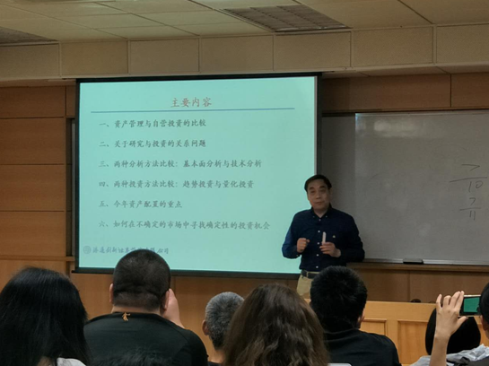 这次主题为资产管理与投资方法比较研究的讲座,时建龙董事长以诙谐幽默的方式分享了自己的资产管理工作经验和投资的规律,全场座无虚席,时老师工作和教学经验丰富,讲授内容深入浅出,指出了证券投资的本质就是寻找未来能持续成长的公司,买入并长期持有,以分享公司红利及股价上涨的收益。会后讨论几位老师和同学都参与了讨论并发表了各自独特的观点,现场观众纷纷表示受益匪浅,讲座在热烈的氛围中落下帷幕。