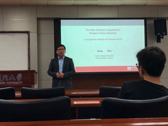 2018年04月26日,星期四下午15:00-16:30,俄亥俄州立大学的终身教授Xiang Wan在嘉庚二201教室分享了主题为“零售竞争在产品多样性决策中的作用:对消费品的实证分析”的演讲。讲座主要有两部分构成。首先,教授进行了自我介绍,包括自己的教育背景以及出国背景。其次,教授分享了他现在正在做的一个课题,即竞争对不同零售业态的产品多样性的影响。讲座参与者包括白云涛老师,许雁翔老师以及对议题感兴趣的老师和学生。
