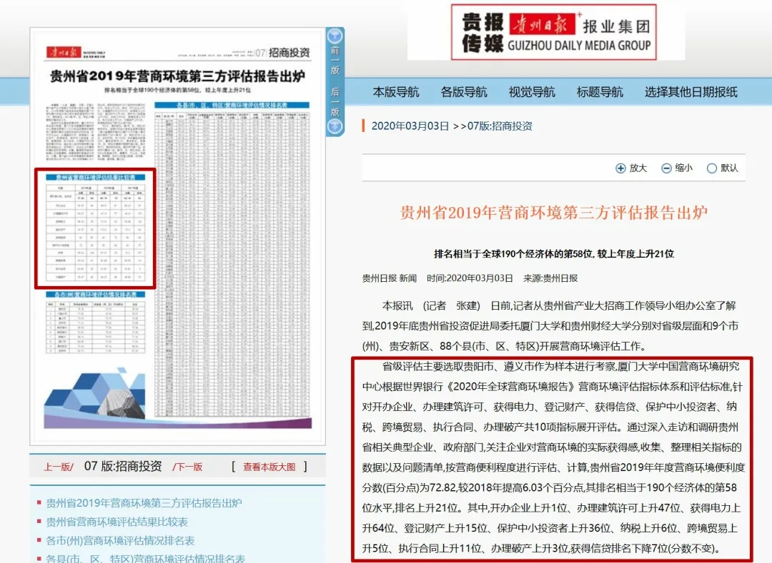 2020年3月3日,《贵州日报》刊登贵州省2019年营商环境第三方评估结果,贵州省2019年度营商环境便利度分数(百分点)为72.82,排名相当于全球190个经济体的第58位水平。贵州省2017-2019年营商环境第三方评估结果如下: