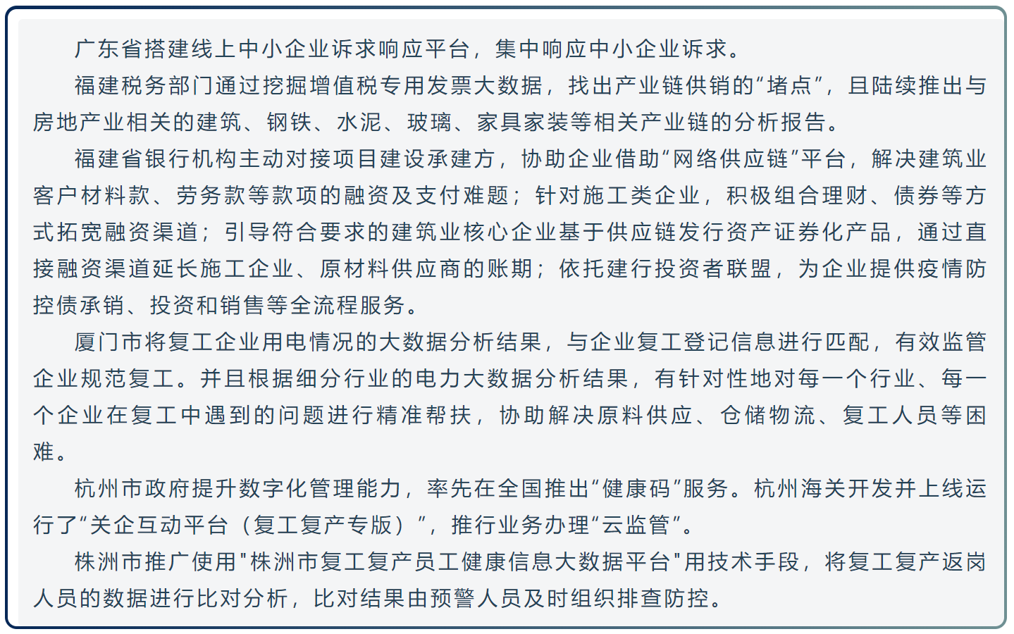 针对中小企业应对疫情、复工复产工作,习近平总书记多次作出重要指示批示,李克强总理多次主持召开国务院常务会议,统筹推进疫情防控和经济社会发展工作,从国家到地方陆续推动出台了一系列惠企政策,包括加大财税支持力度、提高金融可获得性、畅通要素市场流通、支持企业复工稳岗、支持企业创新发展、构建优良营商环境、推动参与国际市场和持续优化公共服务等。