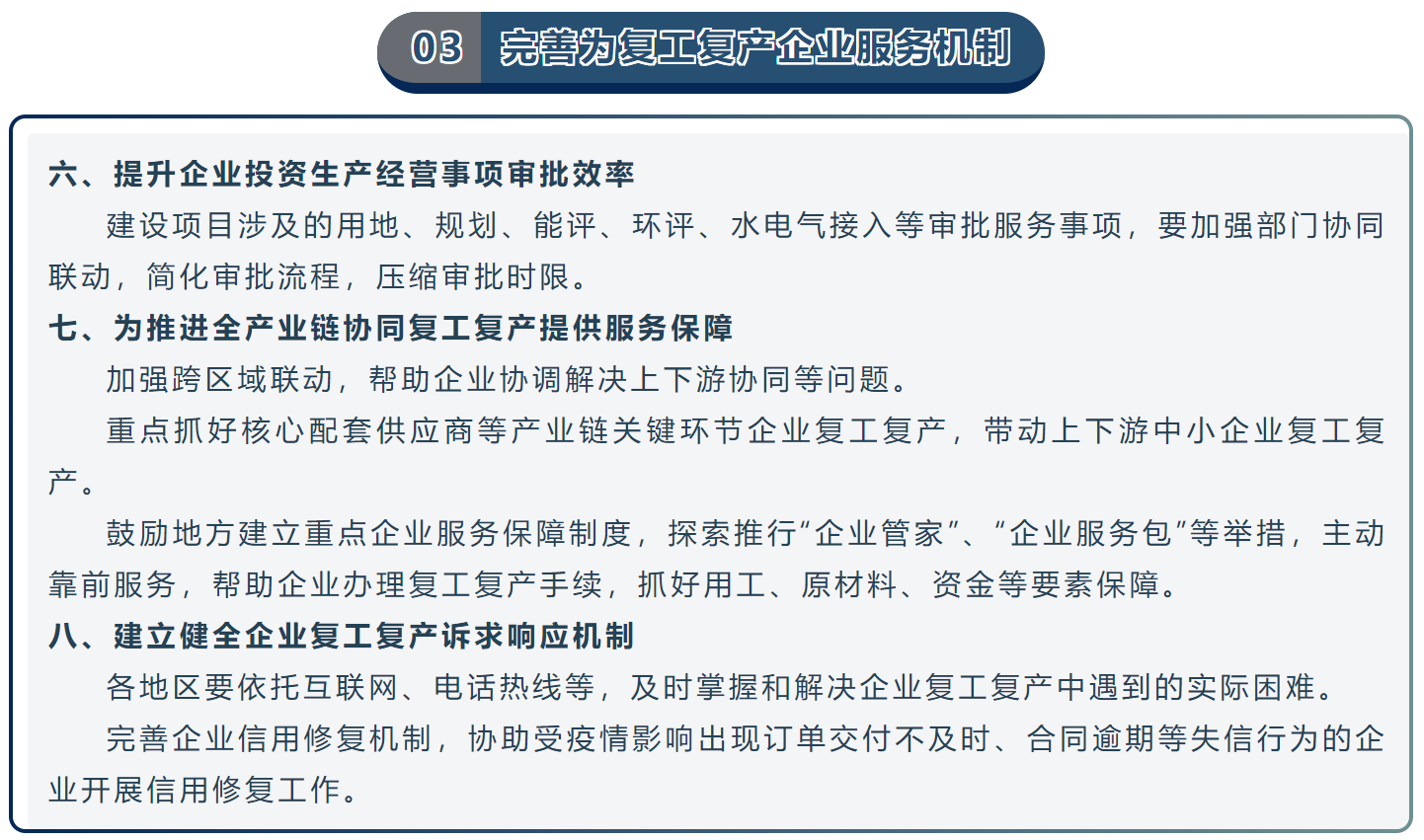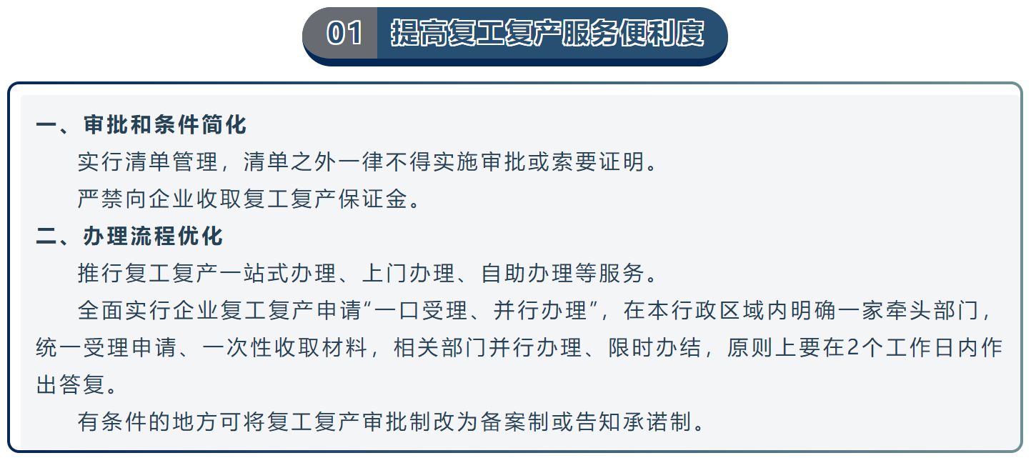 其中针对企业复工复产审批麻烦、盖章多、个别地方出现复工审批形式主义的问题,2020年03月04日,国务院办公厅印发《关于进一步精简审批优化服务精准稳妥推进企业复工复产的通知》,深化“放管服”改革,取消不合理审批,提供便利服务,为企业构建优良营商环境,精准稳妥推进企业复工复产。《通知》提出了五个方面政策措施。