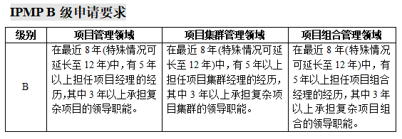 2、IPMP B级(Level B)证书分为三个领域,分别为认证的国际高级项目经理(Certified Senior Project Manager)、认证的国际高级项目集群经理(Certified Senior Programme Manager)和认证的国际高级项目组合经理(Certified Senior Portfolio Manager) 。获得这一级认证的项目管理人员可以管理大型复杂项目,或者管理一项国际合作项目。符合下列条件可以申请IPMP B级: