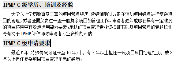3、IPMP C级(Level C)证书称为认证的国际项目经理(Certificated Project Manager),获得这一级认证的项目管理专业人员能够管理一般复杂项目,也可以在所在项目中辅助高级项目经理进行管理。符合下列条件可以申请IPMP C级: