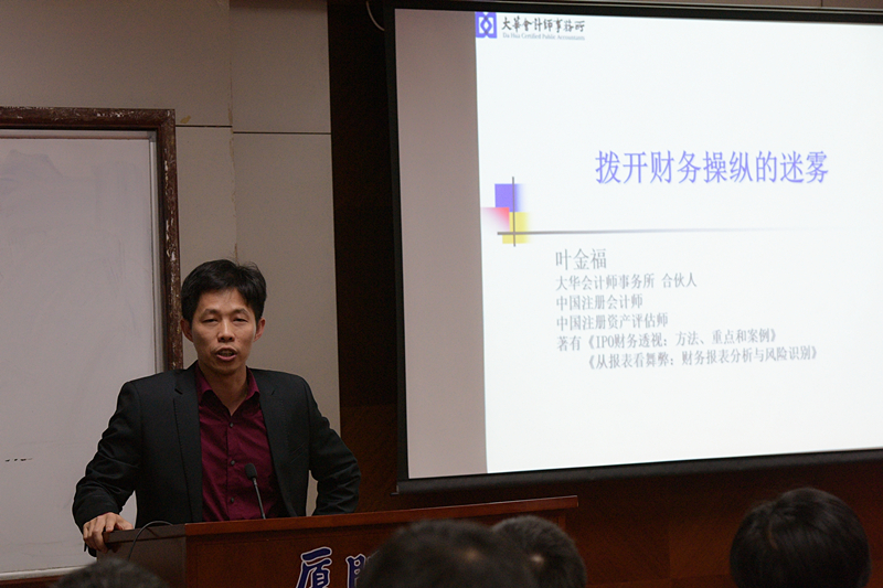3月24日晚上,厦门大学管理学院专业硕士中心系列讲座之二----拨开财务操纵的迷雾讲座在嘉二201顺利举办。本次讲座特别荣幸邀请到厦门大学会计系校友叶金福学长返校开讲,讲座由专业硕士中心副主任黄炳艺老师主持。本次讲座吸引了众多MPAcc学员、部分会计学硕博士研究生、会计系系友前来参加,讲座现场爆满,气氛热烈。