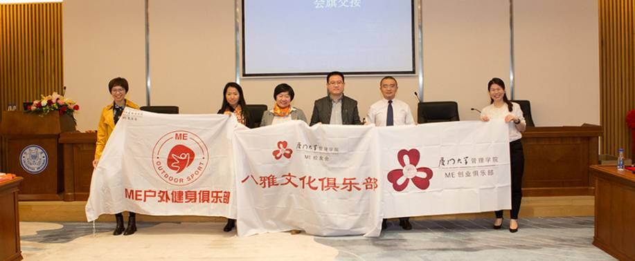 完成聘书颁发后,会议现场新任会长蒋英与上届会长陈辉煌交接ME校友会会旗,并进行了户外健身俱乐部、创业俱乐部的交接和八雅文化俱乐部成立仪式。