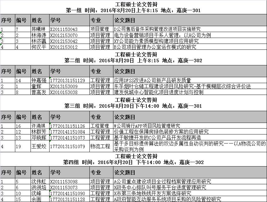 ME中心2016年8月研究生论文答辩具体答辩安排请见下表。