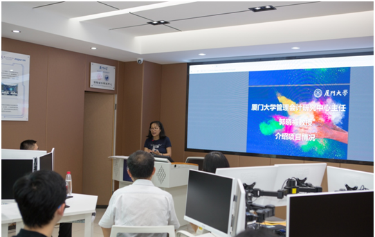 首先,厦门大学管理会计研究中心主任郭晓梅教授介绍本项目发展情况。厦门大学共享财务虚拟仿真教学实验室是由厦门大学管理学院与浪潮铸远有限公司共建的实验室。主要依托厦门大学管理会计中心展开共享财务人才培养的实践。