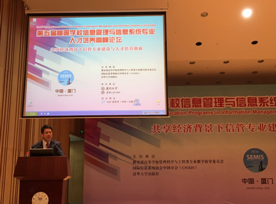 11月26-27日,由教育部高等学校管理科学与工程专业教学指导委员会、国际信息系统协会中国分会(CNAIS)和清华大学出版社主办,厦门大学和清华大学出版社共同承办的“第五届高等学校信息管理与信息系统专业人才培养高峰论坛”在我校隆重举行。此次论坛的主题是共享经济背景下信管专业建设与人才培养创新。来自全国上百所高校的300多名代表出席了论坛。