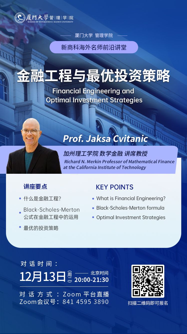 Jaksa Cvitanic博士现任加州理工学院金融数学讲席教授、Linde经济与管理科学研究所所长、Bachelier 金融学会副主席、哥伦比亚大学统计学博士,曾任南加州大学数学和经济学教授、学院副主席,哥伦比亚大学统计学副教授,曾获美国统计协会学术卓越奖(1992 年)。Jaksa博士长期担任《金融与随机》和《数学金融》期刊联合主编,并曾在其他几本期刊的编委任职。他联合其他作者共同创作了《金融市场经济学和数学导论》和《连续时间模型中的合同理论》两本书,并专业科研文章五十余篇。
